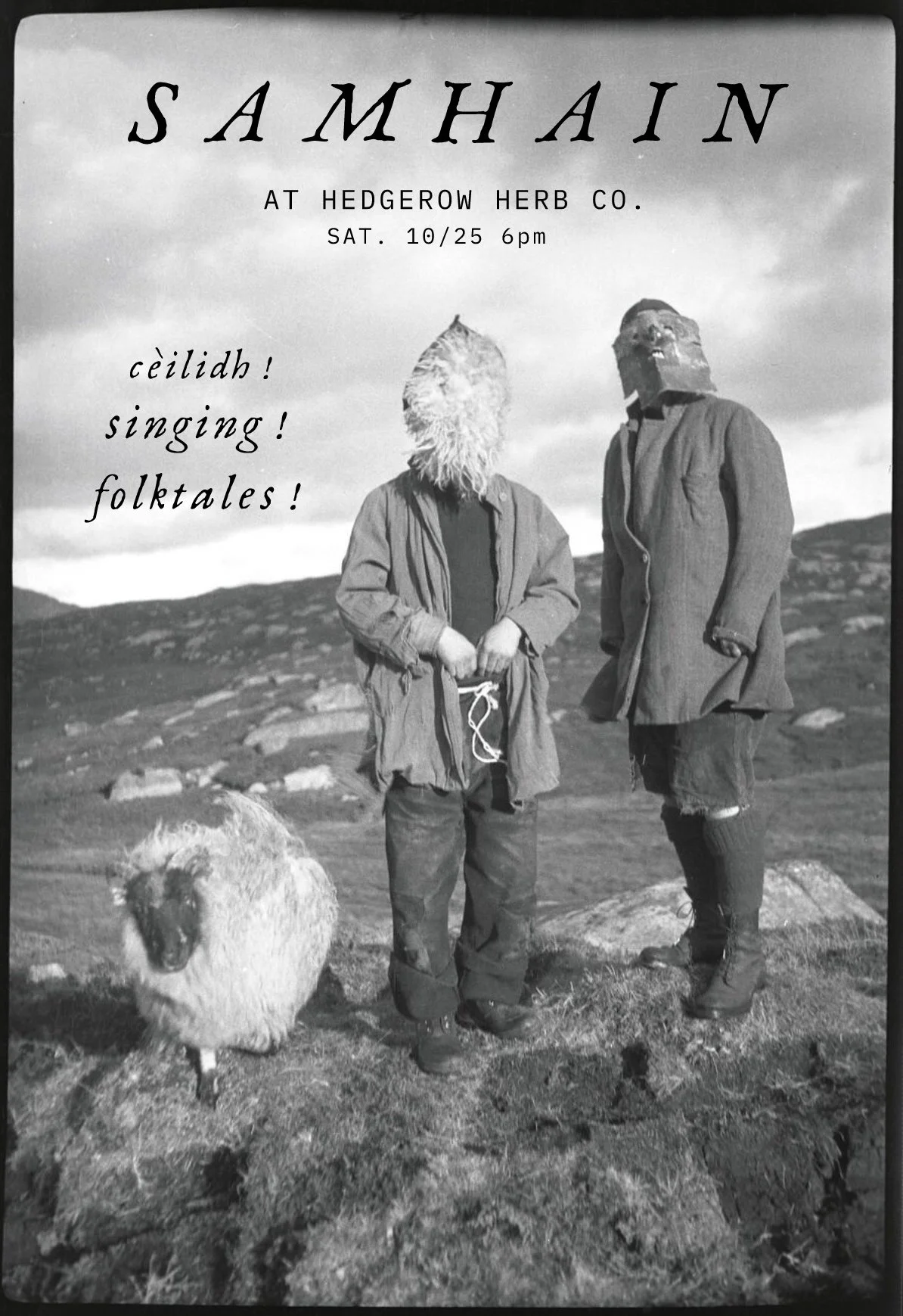 6pm-7pm: Hallowed Hedgerow: Ghost Story & Samhain Singing attendees only. Purchase your ticket for our Samhain event on 10/25 here.